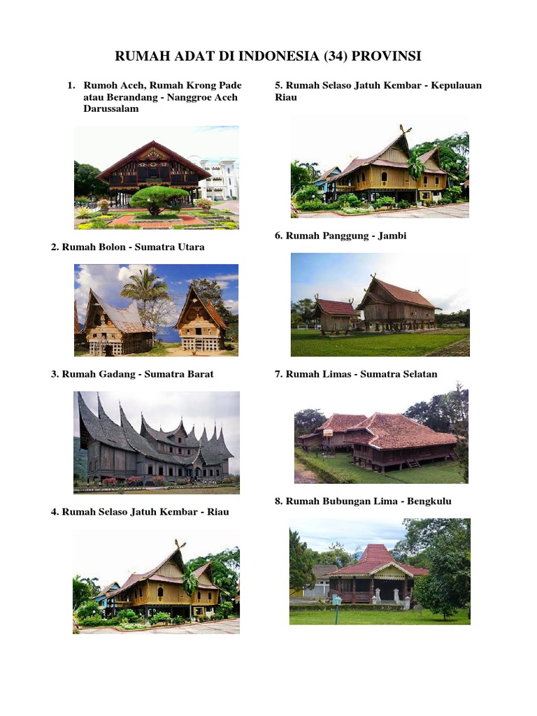 Rumah adat di Indonesia sangat beragam dan mempunyai arti yang penting dalam perspektif sejarah warisan serta kemajuan masyarakat dalam sebuah peradaban. Sumatera ini sebenarnya memiliki beberapa macam rumah adat seperti Bubungan Lima Kubung Beranak Umeak Potong Jang Patah Sembilan dan sebagainya. Nama-nama Rumah Adat Daerah di Indonesia beserta Daerah Asalnya Rumah Adat adalah bangunan yang memiliki ciri khas khusus yang pada umumnya digunakan sebagai tempat hunian atau tempat pelaksanaan upacara tertentu oleh suatu suku bangsa tertentu.